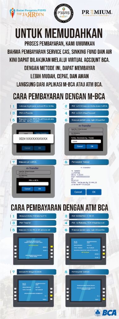 Kami dengan senang hati mengumumkan bahwa mulai bulan Oktober 2024, sistem pembayaran untuk SCSF (Service Charge and Sinking Fund) dan tagihan air kini dapat dilakukan melalui Virtual Account BCA. Inovasi ini bertujuan untuk memberikan kemudahan, kenyamanan, dan efisiensi bagi seluruh penghuni dan pengguna layanan, sehingga pembayaran dapat dilakukan dengan lebih cepat dan praktis.
